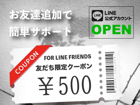公式LINEでお友達登録いただくと、すぐに使える500円クーポンをお届け!簡単お問い合わせや次回のお買い物に大変便利な機能も付いてます。ぜひご利用くださいませ。